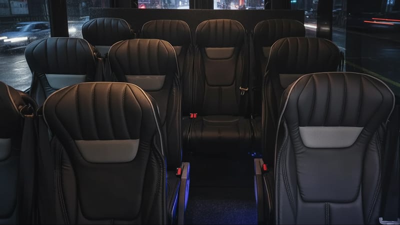 Step into a Mercedes-Benz Sprinter fitted with premium leather captain's chairs, generous legroom and ambient lighting, a cabin that feels closer to business class than a typical transfer. Climate controlled, immaculately clean and spacious enough for your group and all their luggage, without feeling like you're packed into a minibus.
